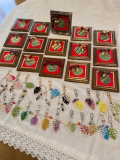 作品は小さい葉・大きい葉のチャーム、クリスマス飾りの3点で、クリスマス飾りは水引きを貼っていく初心者向けのものです。チャームは華やかな色を使い可愛いものが出来ました。